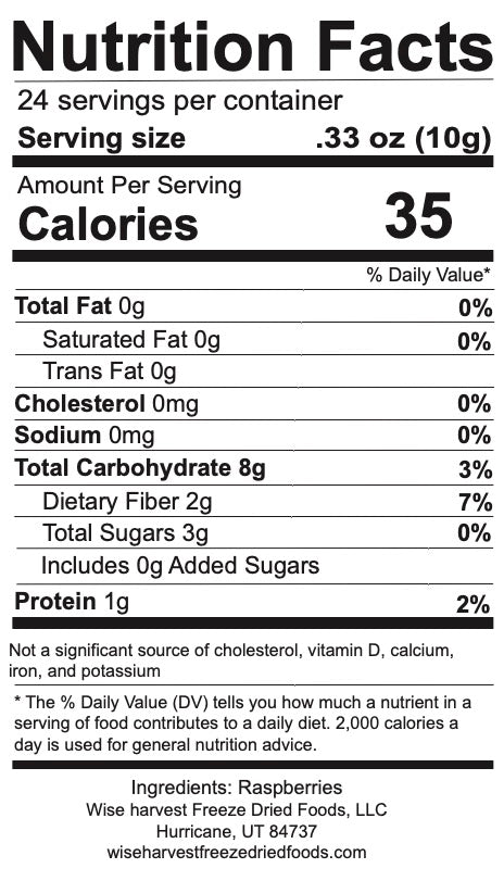 At Wise Harvest Freeze Dried Foods, we take great pride in selecting the very best raspberries for our freeze-dried offerings. Our raspberries are carefully picked at the peak of ripeness, ensuring a burst of deliciousness in every bite. With our 1oz bag of freeze-dried raspberries, you can now enjoy the incredible flavor and satisfying crunch of raspberries anytime, anywhere. No longer limited by seasonality, you can have these delectable fruits readily available in your pantry to enhance your cooking, baking, or snacking experiences.